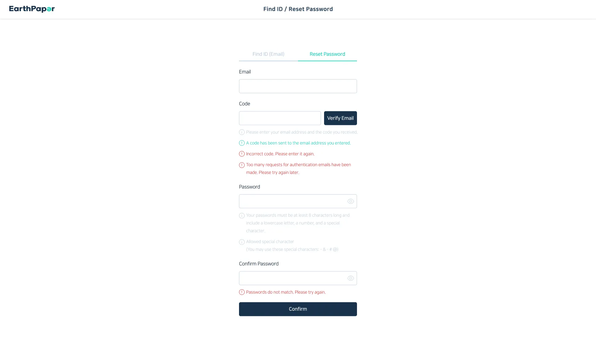 Click the 'Reset Password' button on the EarthPaper login page.
