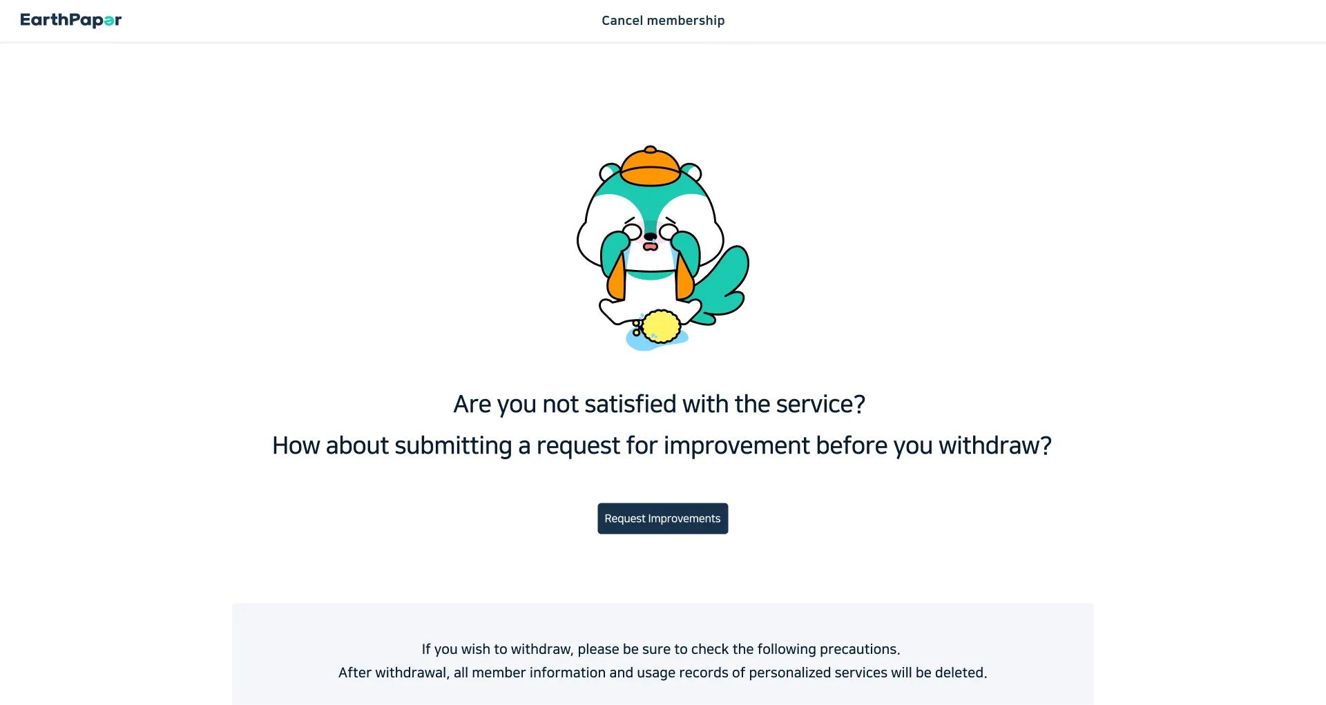 To delete your account, please navigate to the 'My Page' section on EarthPaper and follow the provided instructions.